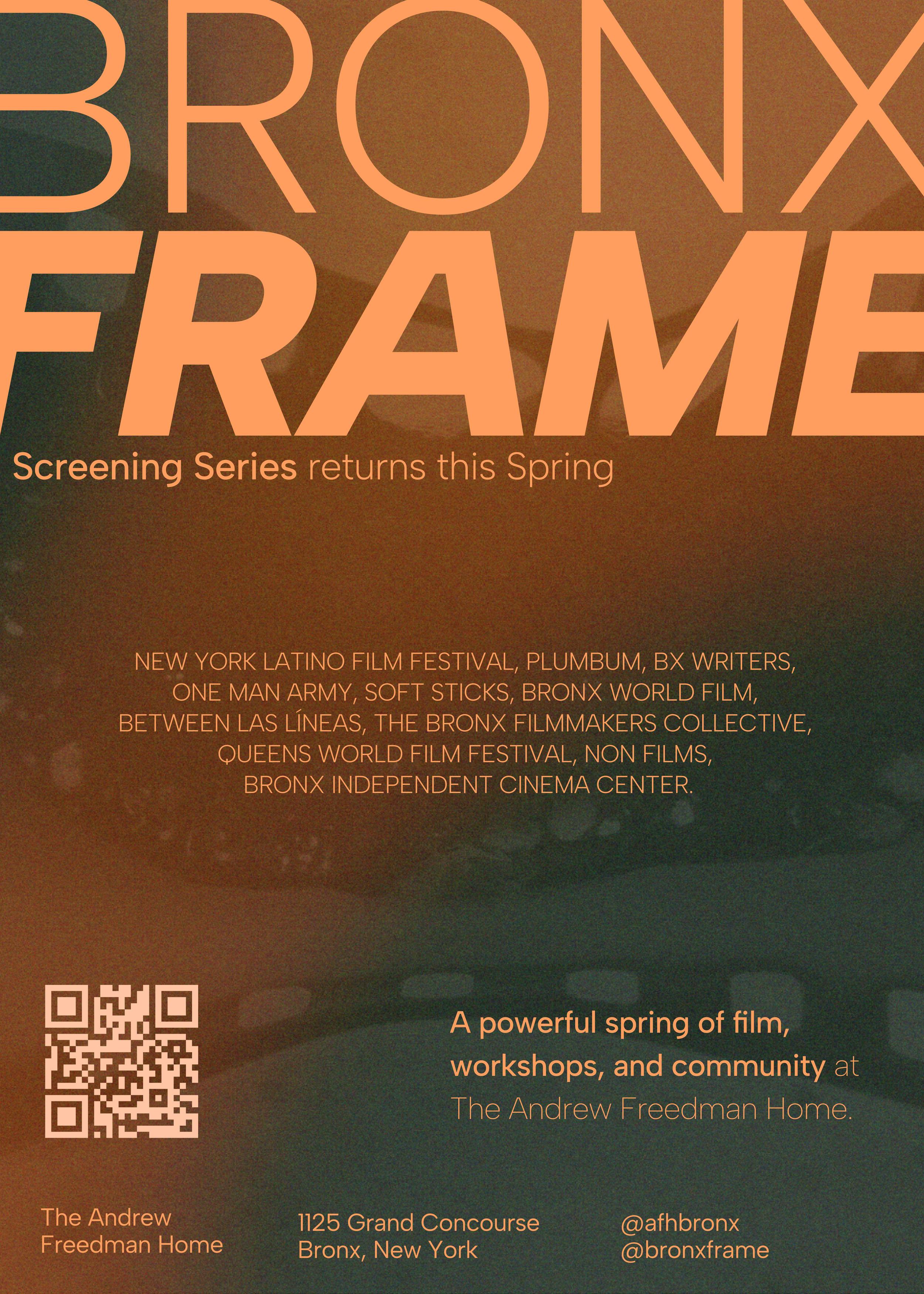 Bronx Frame is the film and moving-image exhibition and public programming initiative of the historic Andrew Freedman Home in the Bronx. Dedicated to amplifying Bronx storytellers across generations, Bronx Frame partners with film curators and programmers to present screenings, community-centered programs, artist talks, and hands-on workshops that expand access to cinema and media arts within the borough.