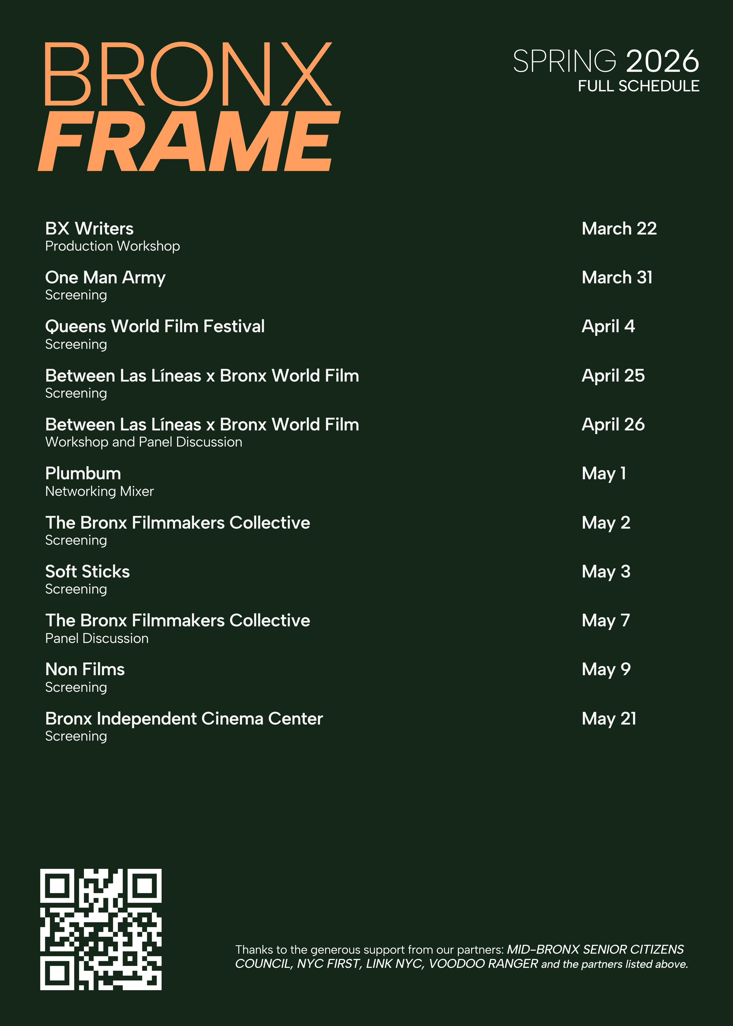 Each spring and fall, the Bronx Frame Screening Series showcases a dynamic mix of experimental, documentary, and narrative films which amplify the voices of both Bronx-based and global creators. Past partners include the New York Latino Film Festival, The Bronx Filmmakers Collective, Bronx World Film, Non Films, BX Writers, Between Las Líneas, Queens World Film Festival, Bronx Independent Cinema Center, One Man Army, Blank Roll, Soft Sticks, Plumbum, Cinema on the Sound, Baby Teeth Film Festival and the Trans Film Collective.